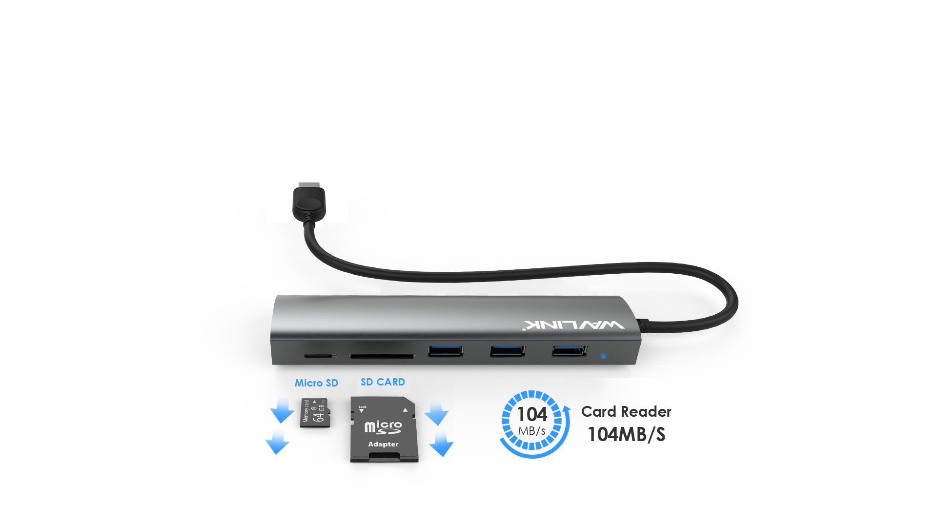 Faster Writing and Reading SpeedWith a speed up to104MB/S, the hub provides you a smooth writing and reading speed through SD and Micro SD Card ports, making data transfer easier and faster.
